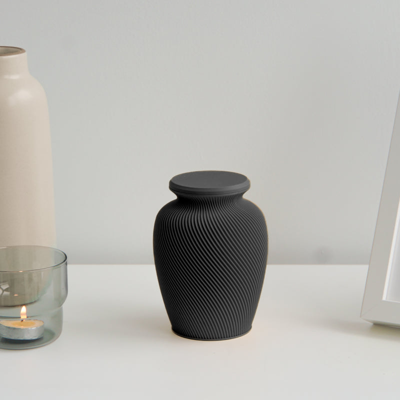 Gracefully merging classic form with a refined modern sensibility, the Elm Urn is a quiet testament to thoughtful design and heartfelt remembrance. Its timeless silhouette—characterized by gently sculpted shoulders and a softly flared rim—offers a feeling of openness and dignity. The surface is adorned with an intricate spiral texture, evoking the natural rhythm of wind through trees or ripples across still water. This subtle movement adds depth and vitality, symbolizing the continuation of memory and the enduring presence of love.