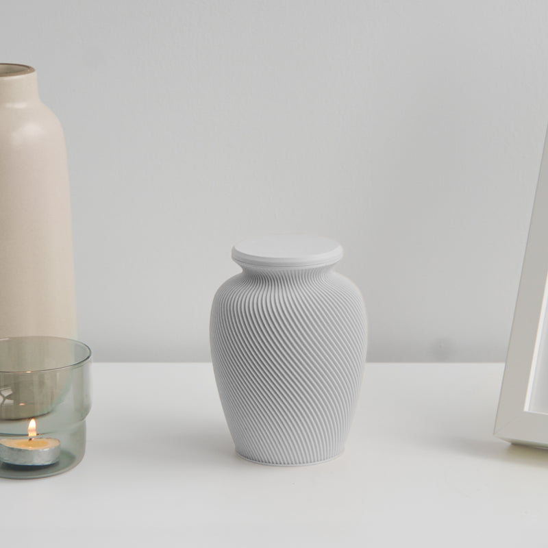 Gracefully merging classic form with a refined modern sensibility, the Elm Urn is a quiet testament to thoughtful design and heartfelt remembrance. Its timeless silhouette—characterized by gently sculpted shoulders and a softly flared rim—offers a feeling of openness and dignity. The surface is adorned with an intricate spiral texture, evoking the natural rhythm of wind through trees or ripples across still water. This subtle movement adds depth and vitality, symbolizing the continuation of memory and the enduring presence of love.